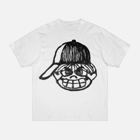 Grinsnap Tee in white, crafted from premium Australian Cotton Breeze (235gsm) or Japan Cotton (200gsm) for superior durability and comfort. Features a semi-boxy fit that balances contemporary style with wearability. The design showcases striking silver glittered plastisol print or crisp white plastisol detailing with half-coverage application, creating visual depth and dimension. Built for everyday wear with quality construction that withstands regular washing and wear.