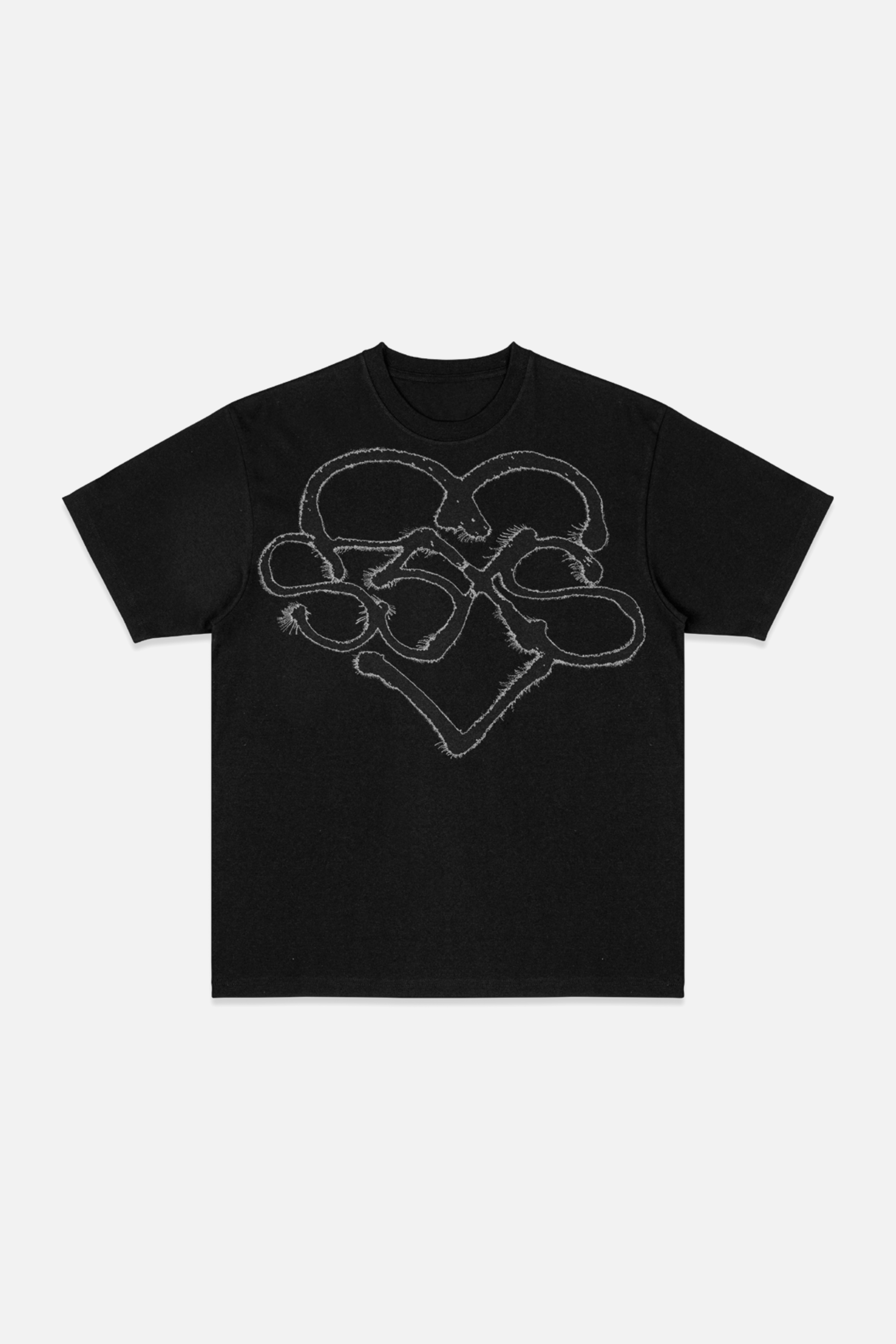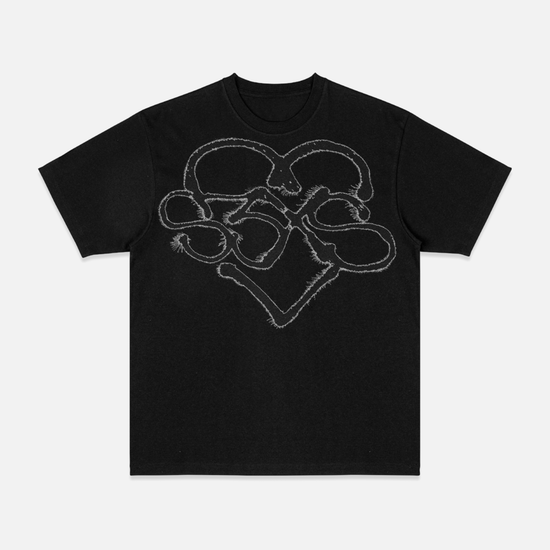HeartS3XS Tee in black, crafted from premium Australian Cotton Breeze (235gsm) or Japan Cotton (200gsm) for superior durability and comfort. Features a semi-boxy fit that balances contemporary style with wearability. The design showcases striking silver glittered plastisol print or crisp white plastisol detailing with half-coverage application, creating visual depth and dimension. Built for everyday wear with quality construction that withstands regular washing and wear.
