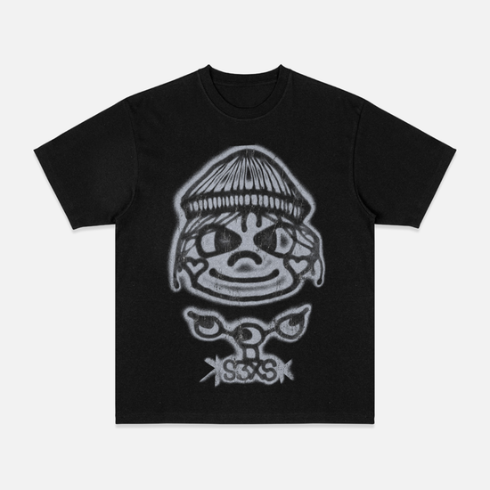 Beanieface Tee in black, crafted from premium Australian Cotton Breeze (235gsm) or Japan Cotton (200gsm) for superior durability and comfort. Features a semi-boxy fit that balances contemporary style with wearability. The design showcases striking silver glittered plastisol print or crisp white plastisol detailing with half-coverage application, creating visual depth and dimension. Built for everyday wear with quality construction that withstands regular washing and wear.