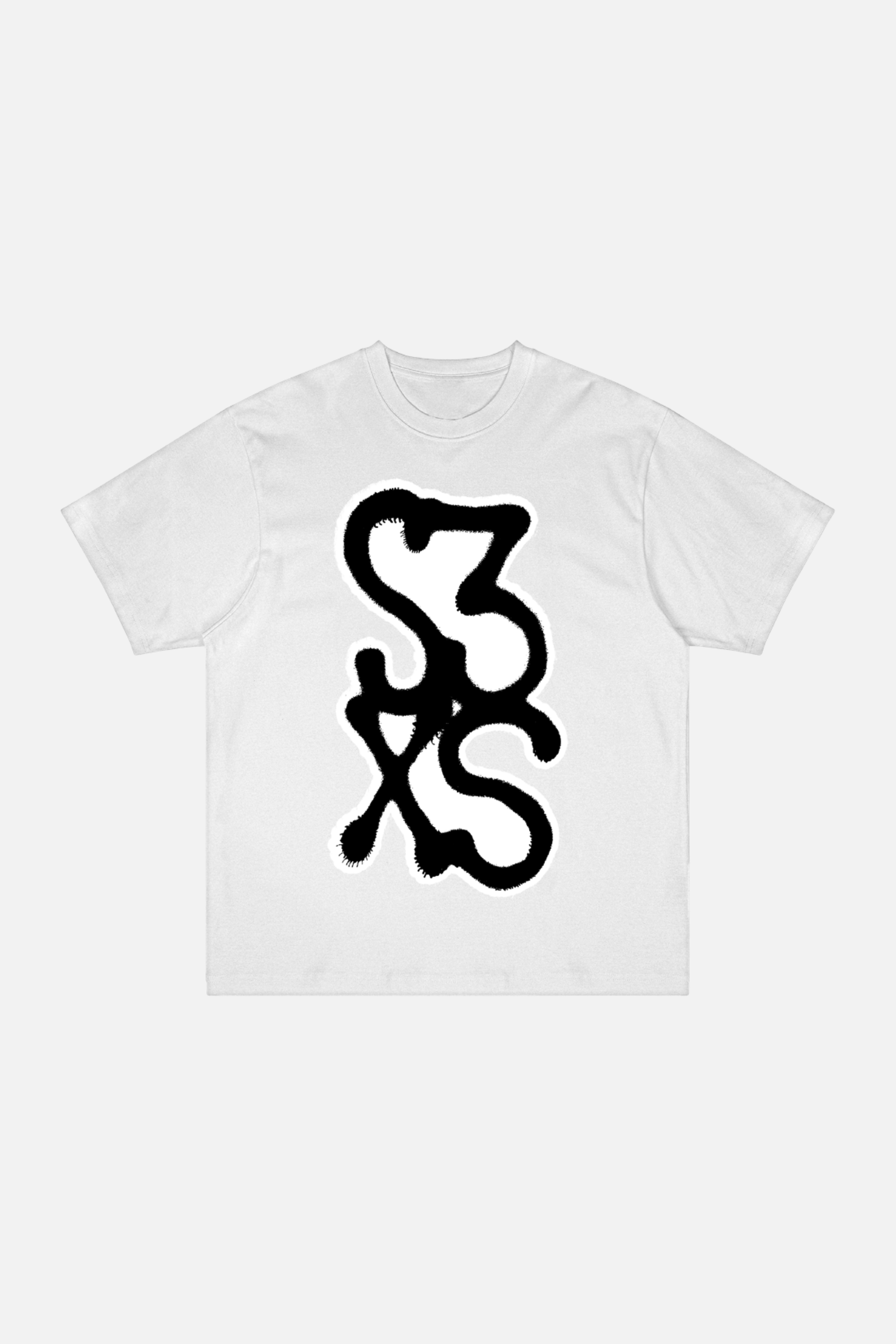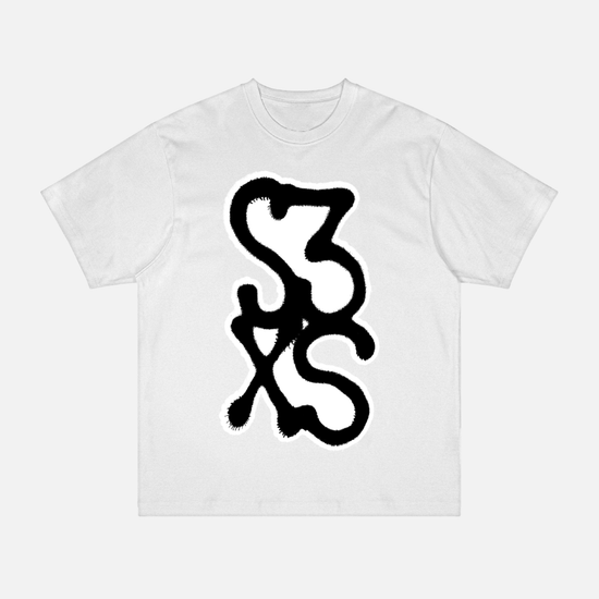 StackS3XS Tee in white, crafted from premium Australian Cotton Breeze (235gsm) or Japan Cotton (200gsm) for superior durability and comfort. Features a semi-boxy fit that balances contemporary style with wearability. The design showcases striking silver glittered plastisol print or crisp white plastisol detailing with half-coverage application, creating visual depth and dimension. Built for everyday wear with quality construction that withstands regular washing and wear.
